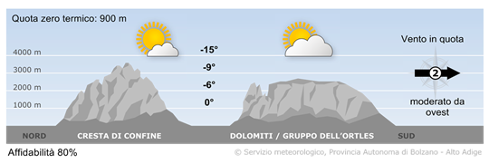 La giornata inizierà con tempo parzialmente soleggiato. A nord le nubi tenderanno a diradarsi mentre a sud gli annuvolamenti saranno più consistenti. Verso sera la nuvolosità aumenterà ulteriormente con locali debolissime nevicate nella notte. Temperature minime tra -15° e -1°, massime tra -1° e 7°.