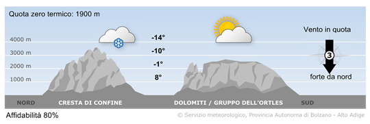 Sulla cresta di confine orientale ci saranno ancora delle nevicate. Altrove il vento da nord garantirà delle schiarite, con tratti soleggiati soprattutto sui gruppi a meridione.