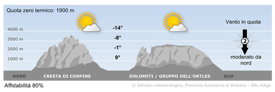 Sulla cresta di confine al mattino il cielo sarà molto nuvoloso con possibili deboli nevicate a tratti. Nel pomeriggio arriveranno delle schiarite. A sud il tempo sarà migliore con tratti soleggiati sempre più lunghi. Temperature in calo. Venti da nord in rafforzamento.
