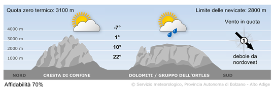 Temperature in calo: La giornata di lunedì inizierà con tempo soleggiato. Nel pomeriggio si formeranno delle nubi cumuliformi con possibilità di qualche rovescio soprattutto sui gruppi a meridione. Martedì il tempo sarà più variabile con sole a tratti e possibilità di qualche rovescio. Le temperature saranno in calo e torneranno su valori consoni alla stagione. Anche mercoledì il tempo sarà instabile con sole e nubi accompagnate da qualche rovescio. Per giovedì si prevede tempo generalmente soleggiato, nelle valli settentrionali soffierà il Föhn.
