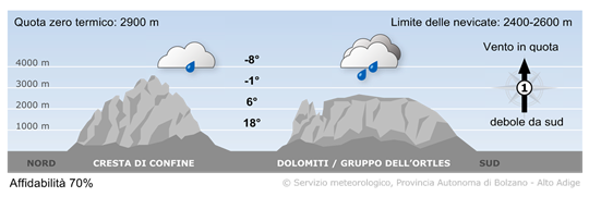 La giornata inizierà con tempo generalmente soleggiato. Con il passare delle ore si svilupperanno delle nubi cumuliformi con possibilità di qualche rovescio soprattutto sui gruppi a meridione. Temperature minime tra 3° e 12°, massime tra 22° e 28°.