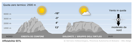 Fino a metà giornata si registreranno precipitazioni su molti gruppi montuosi. Di seguito i fenomeni si esauriranno ad iniziare dalla cresta di confine e le nubi tenderanno a diradarsi.